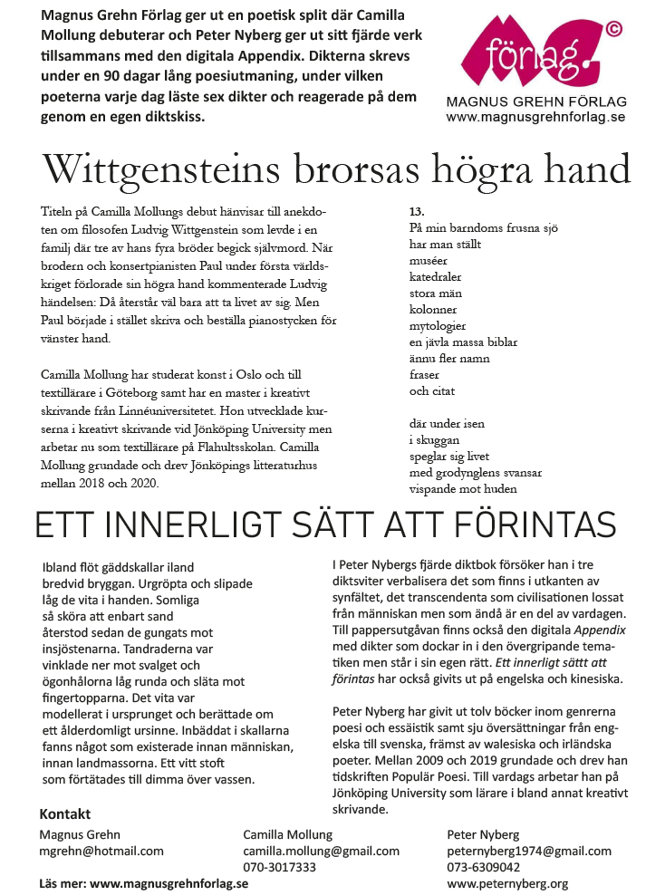 I december påbörjade jag en ny omgång poesiutmaning. Egentligen är det inte så mycket utmaning som vana numera; jag går en promenad, läser tre dikter ur tre diktböcker och skriver en egen dikt. Som poeten Stefan Albrektsson sade om den första utmaningen: när läsningen är klar är halva jobbet gjort. Följaktligen står jag i skuld…