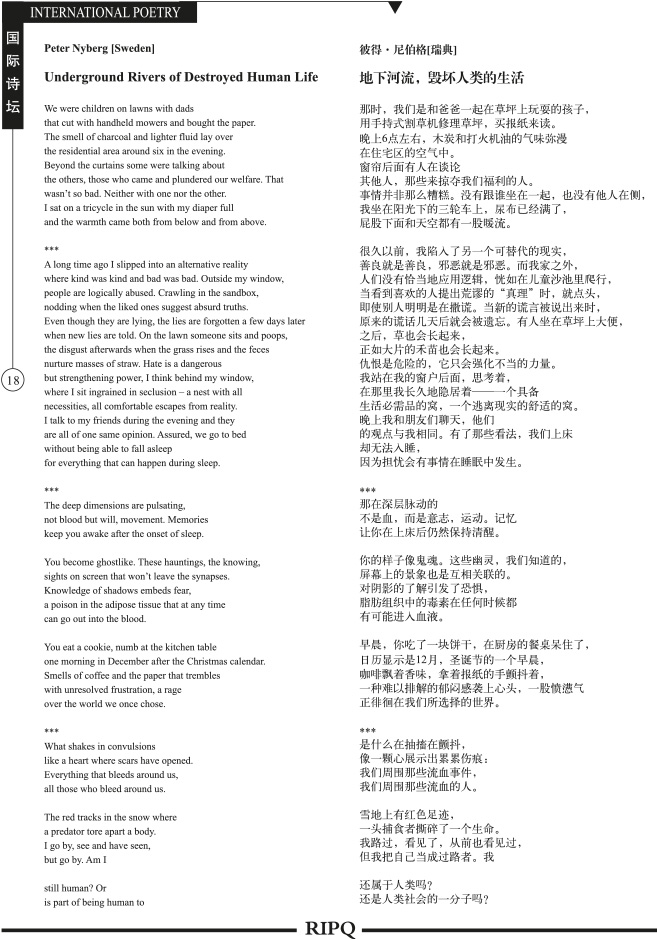 I årets första nummer av Rendition of International Poetry (nummer 109 i ordningen) finns hela den tredje sviten ”Underjordiska floder av söndrade människoliv” i Ett innerligt sätt att förintas med på engelska och kinesiska. Sammantaget sträcker sig diktsviten från sidan 18 till 22 i tidningen.