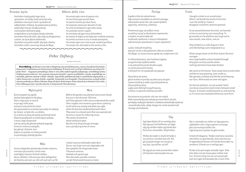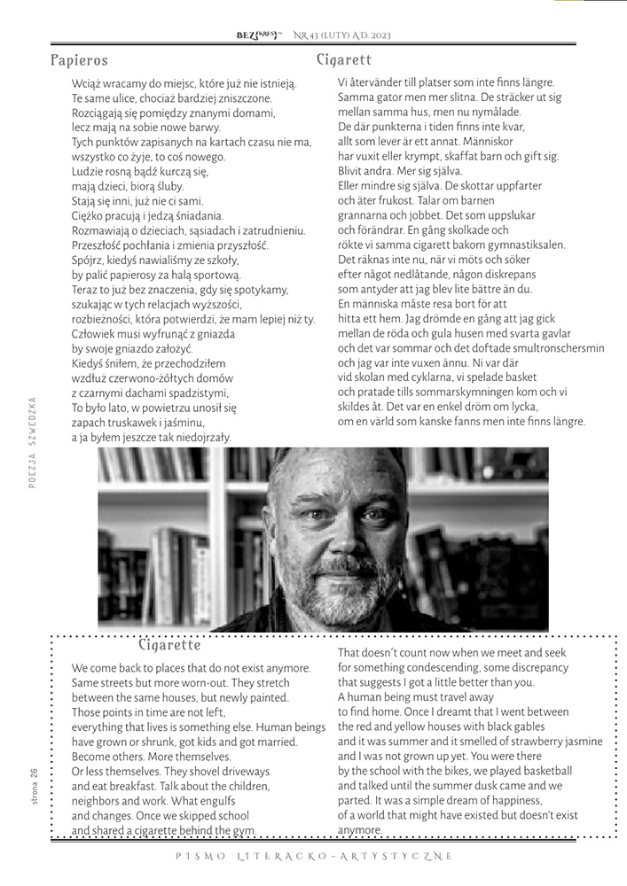 I mitten av december började jag samarbeta med den polska poeten Norbert Gòra. Lagom till världspoesidagen fick jag två bilder på att tre av mina dikter har publicerats i nummer 43 i tidskriften Bezkres. Det är en internationell tidskrift som tar in poeter från hela världen och publicerar texterna på polska, svenska (för min del) och engelska. Dikterna kommer från avdelningen ”Appendix” i Ett innerligt sätt att förintas. Så här ser det ut: