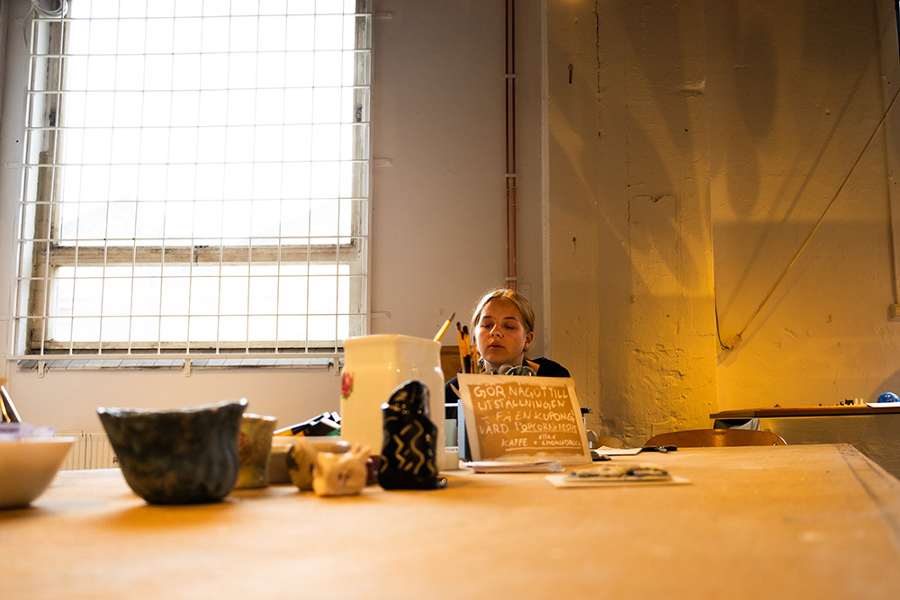 I morgon, söndag, är sista chansen att delta i utställningen Konst är en lek är en konst där ni får göra anteckningsböcker, skriva poesi eller bygga med lera som en följd av sommarverksamheten med ungdomar. Som det står på skylten – gör en grej och du får välja en godsak på en vagn fullastad med chips, popcorn, festis, kaffe och chokladbollar.