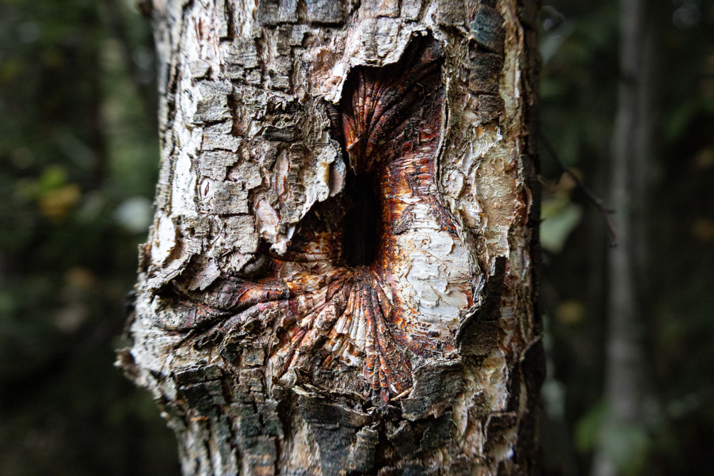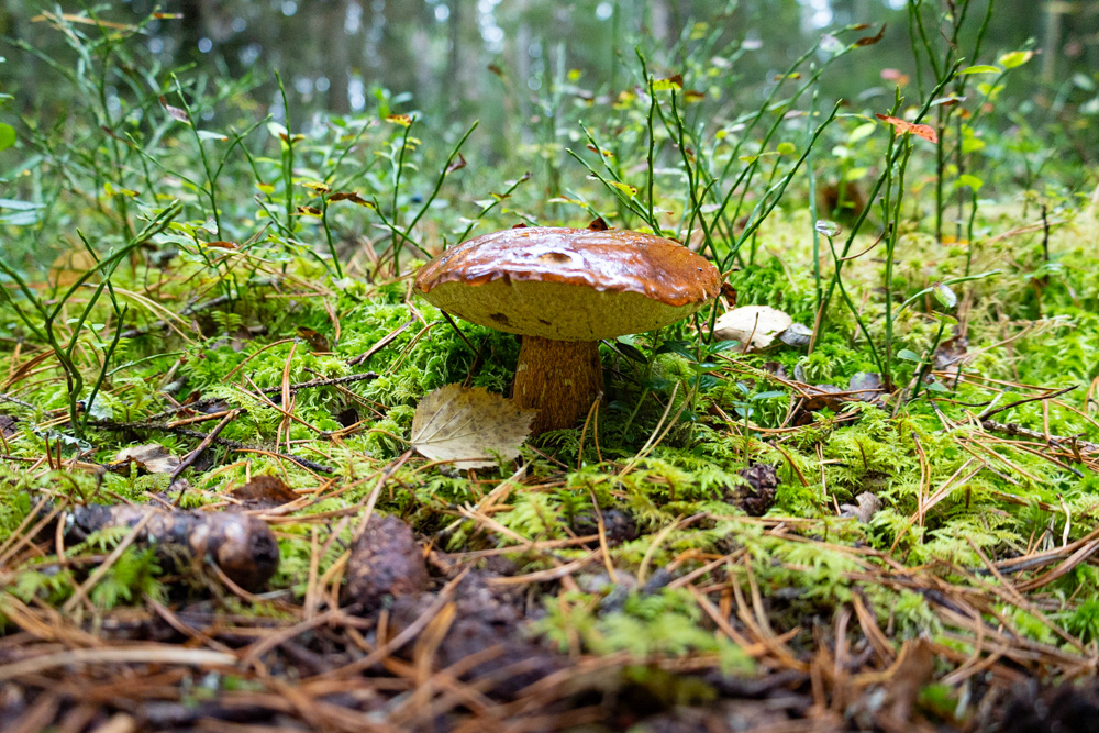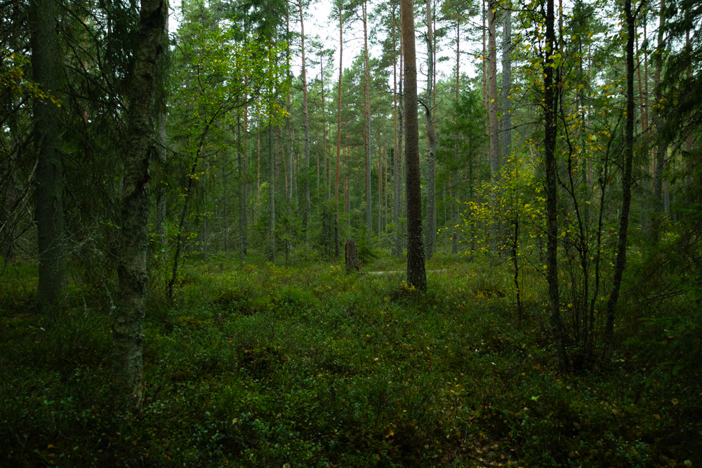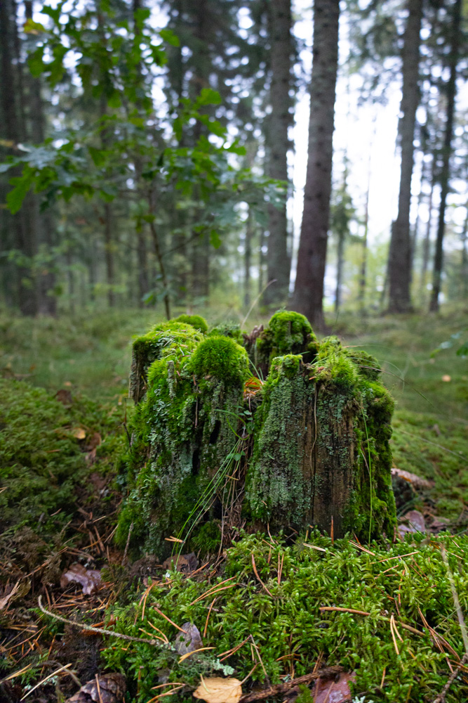 Medan jag går med Humla ser jag att senaste dagarnas väta har gjort kontrasterna i naturen skarpare. Mossan under vegetationen har antagit en djupare färg än tidigare och de fallna stammar vid stigarna har mörknat i kontrast till de ljusorangea barren och löven som ligger på dem. Det är nyanser som jag inte förmår att fånga med en kamera, ögat är så finkalibrerat i förhållande till tekniken. Ändå gör jag ett försök.