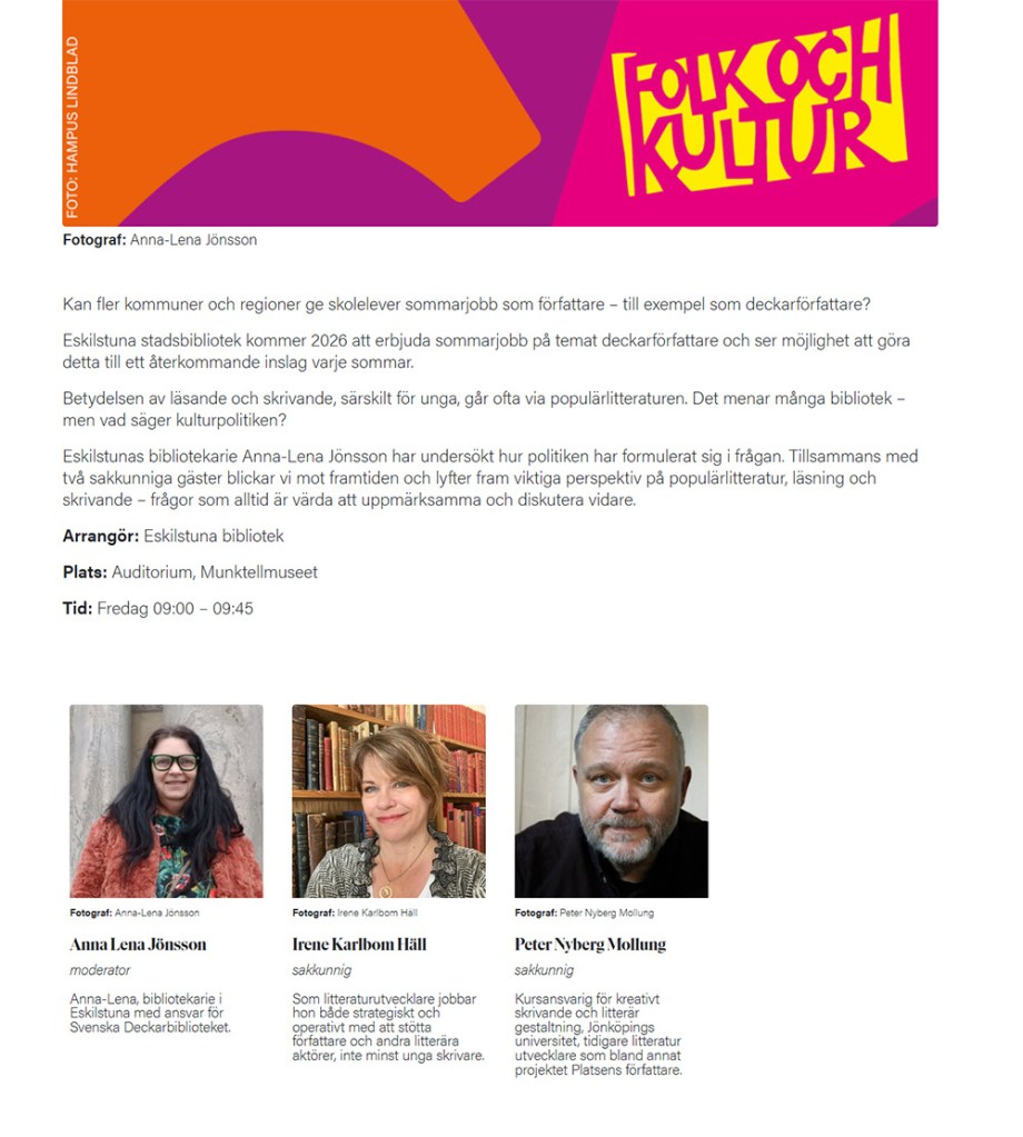 Jag är inbjuden till Eskilstunas stora konvent Folk och kultur för att prata om unga skrivande i allmänhet och Platsens författare i synnerhet. Om du händelsevis är på konventet, leta dig fram till auditoriet på Munktellmuseet vid nio-rycket på fredag morgon! Det blir kul!